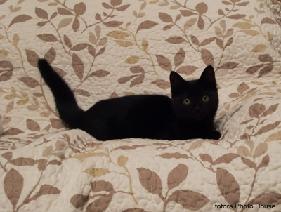 2009年、冬 黒色の仔猫が家にやってきました。 野良ニャンコ♀(3ヶ月) 悩んだ挙句につけた名前は 「 トトラ・クール・クローネ」 略してクーとなりました。 <<back menu next>> 家に着たばかりの黒ニャンコさんは、とにかく臆病者でして ピアノの裏に隠れて丸一日…冷蔵庫の裏に隠れて丸一日… 止む終えずケージに入れて2週間… 近づくと「シャー!」…と威嚇されまくりで、 こうして写真を撮れるようになるまで、結構、大変でした…汗