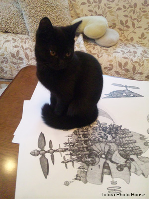 「だいぶ人に慣れてきたニャンコさん」 何故か少しでも高い所にいたがるニャンコです。 原稿の上に乗っては転がりまくり、机の上の 鉛筆やら消しゴムやらペンやらは全て弾き飛ばしてくれます…。 空いてるトコはいくらでもあるのに なんでわざわざ紙(しかも原稿・原画)の上に乗るんだろ う…泣