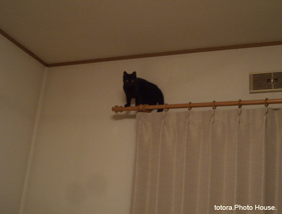 「カーテンレールのニャンコ」 猫の運動神経って凄いです。 ついにカーテンをよじ登って天井近くまで出現…(おかげでカーテンがボロボロ…汗) これはマズイ…という事でネコタワーを導入する事に なりました。