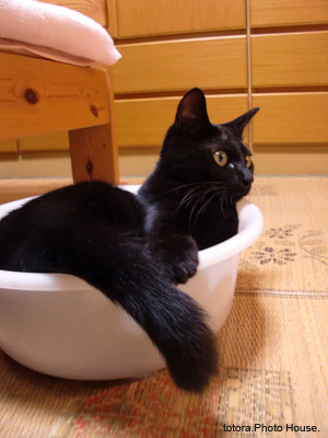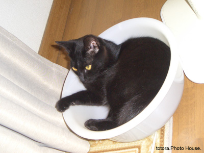 「タライのニャンコ」 ダンボールを片付けてしまった後、しばらくニャンコのお気に入りだったタライ。 水槽の水交換用だったのですがニャンコに取られました。 体が入ろうが入らなろうがおかまいなし。