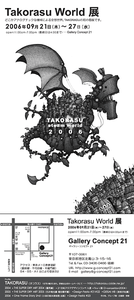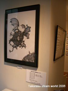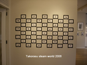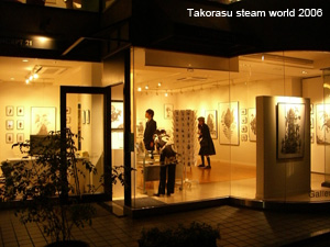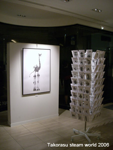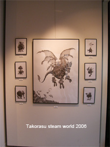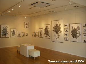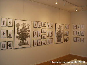 | 「個展」(Takorasu steam world 2006) お陰様で無事に個展を終える事ができました。 お立ち寄り下さいました皆様、 どうも有難うございました。 見に来れなかった方へ 会場の写真を アップしてみました。 雰囲気だけでも感じて貰えると嬉しいです。 夜撮ったので照明の映り込みで 色が付いてますが、実際は白と黒の空間。 またどこかで作品を見掛ける機会がありましたら その時はどうぞ宜しくお願い致します。 by Takorasu 2006.09.28 |